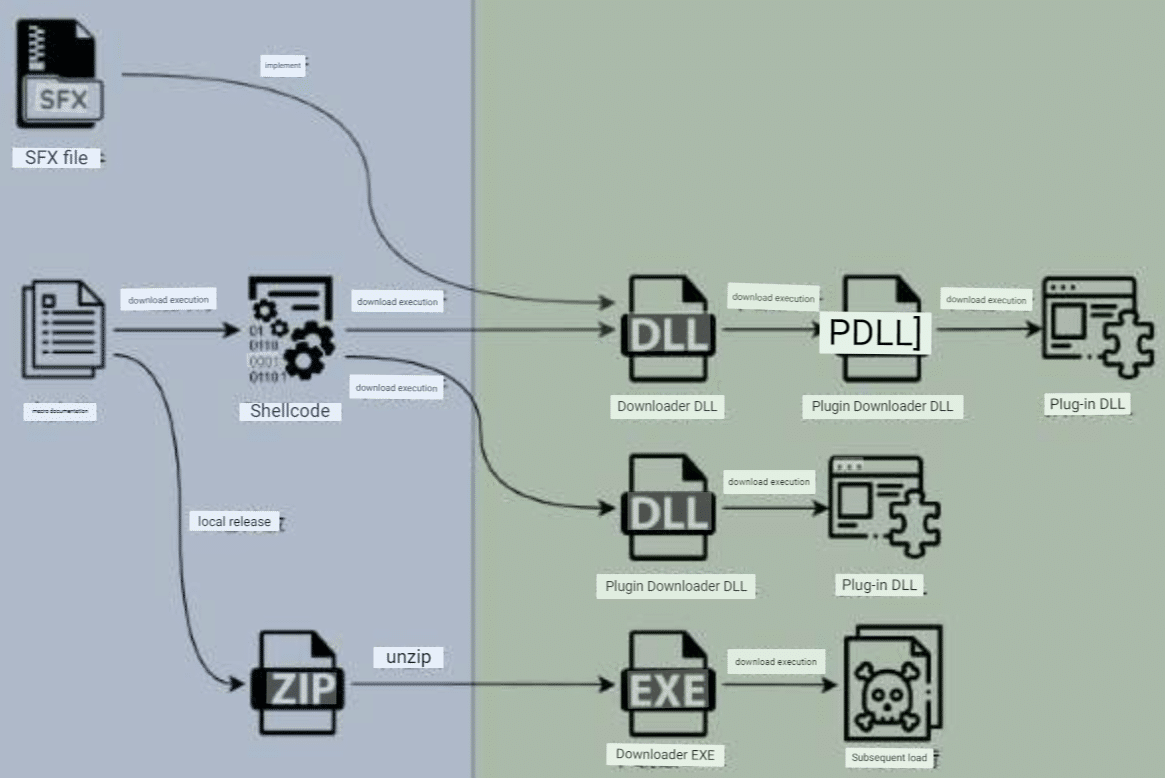 The Donot group frequently uses macros in documents to execute shellcode and download additional DLL components. These DLLs have the ability to download additional harmful components, including Trojan plugin managers and Trojan plugins. Attackers supply downloader DLL components directly through self-extracting RAR packages in attack samples that use documents about the Kashmir region as their lure. Additionally, in some attack efforts, the Donot group employs EXE components to download other components, which are directly released from compressed packages using macro documents.